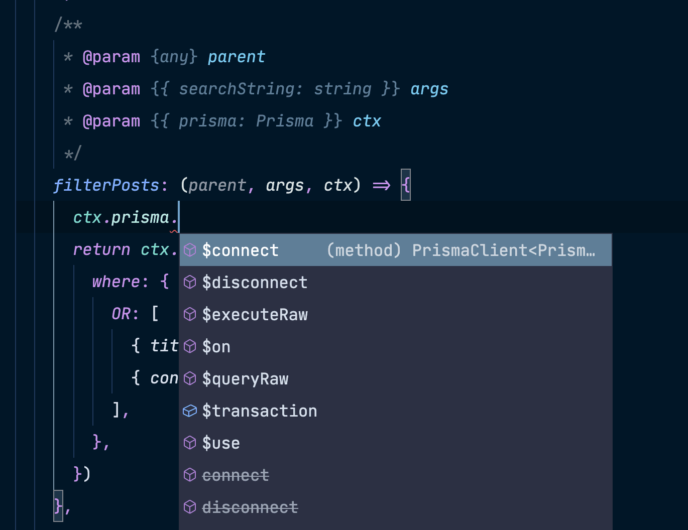 ¥This will tell VS Code that the context has a property named prisma and the type is Prisma which was defined in the @typedef above.