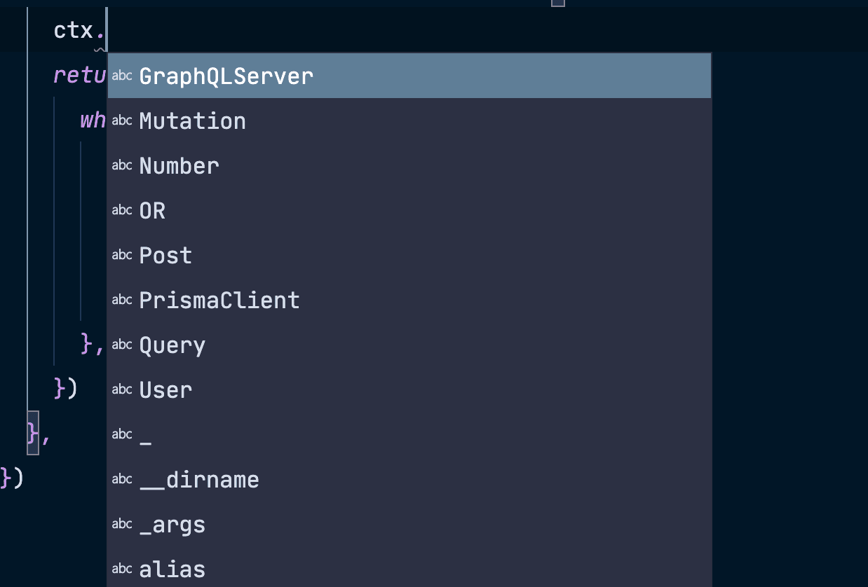 ¥When using GraphQL with TypeScript, you always get autocompletion for the Prisma Client instance in your GraphQL resolvers because then the context object can be typed – no matter if folks are using Nexus, TypeGraphQL or SDL first. This immensely helps with autocompletion and preventing unwanted errors.
