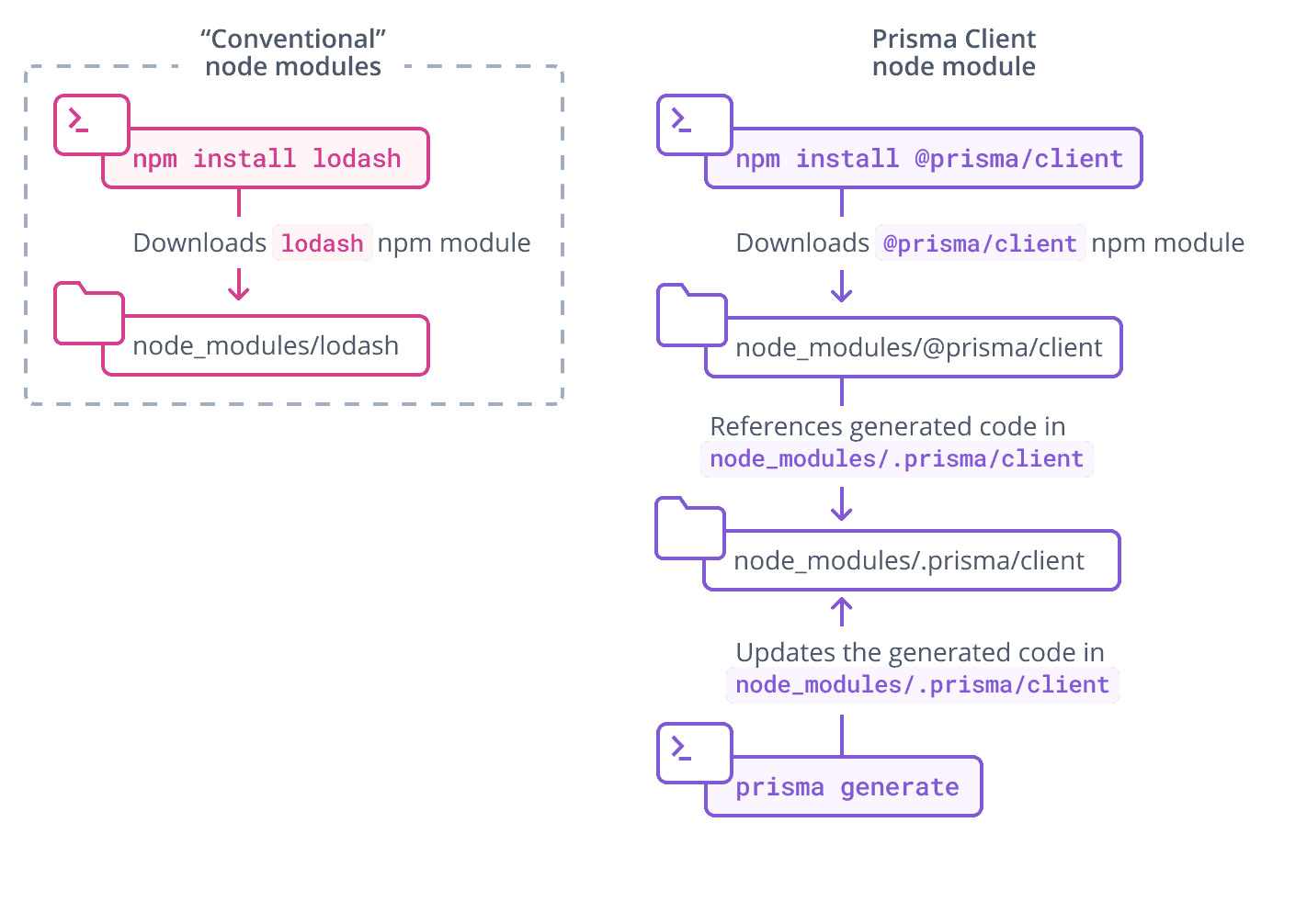 ¥Prisma Client is generated from your Prisma schema and is unique to your project. Each time you change the schema (for example, by performing a schema migration) and run prisma generate, Prisma Client's code changes: