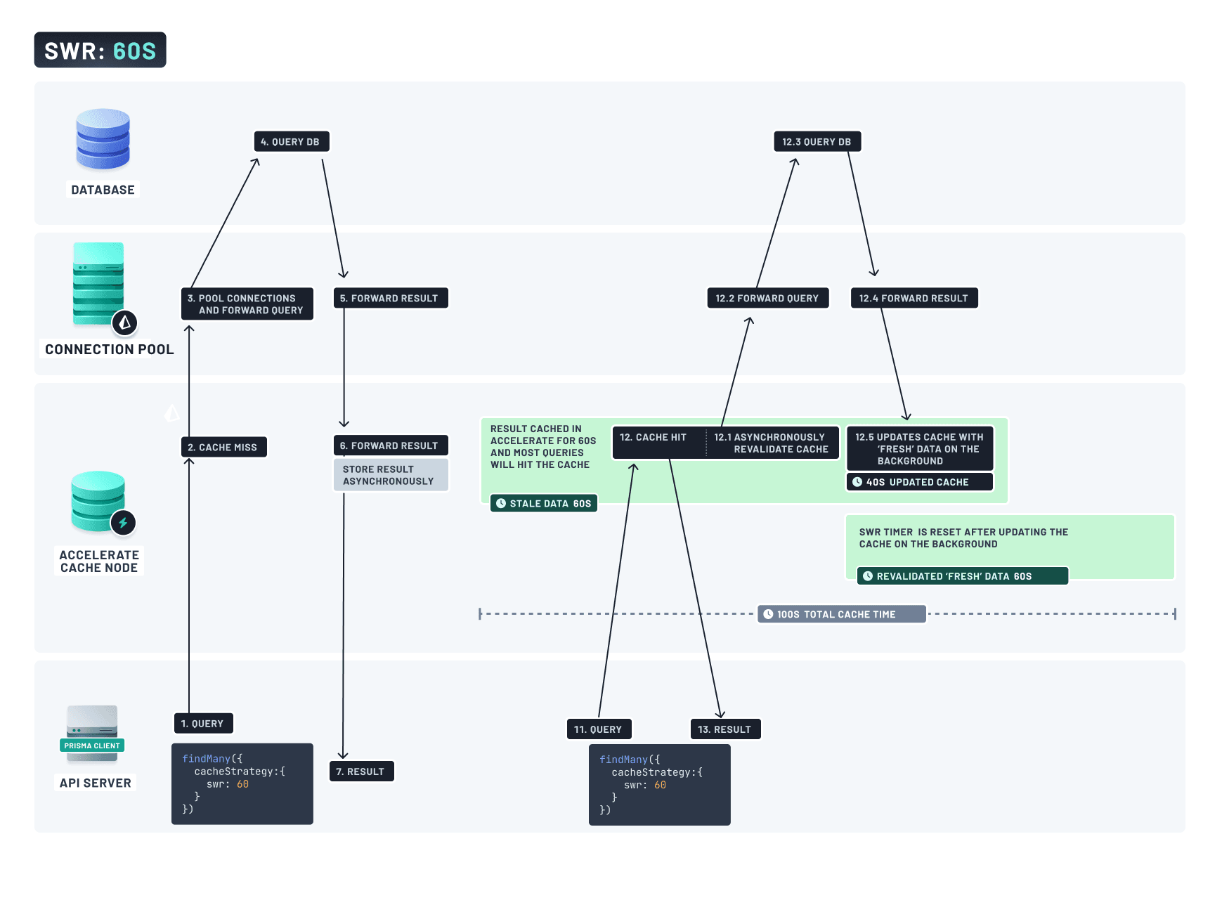 Stale-While-Revalidate (SWR) 允许你控制 Prisma Postgres 在后台获取新数据的同时,可以保留过时的缓存数据的时间。执行读取查询时,Prisma Postgres 会根据 swr 时长检查缓存响应的时长。如果缓存数据在 swr 限制范围内,Prisma Postgres 会提供过时的数据,同时通过从数据库获取最新数据来刷新缓存。