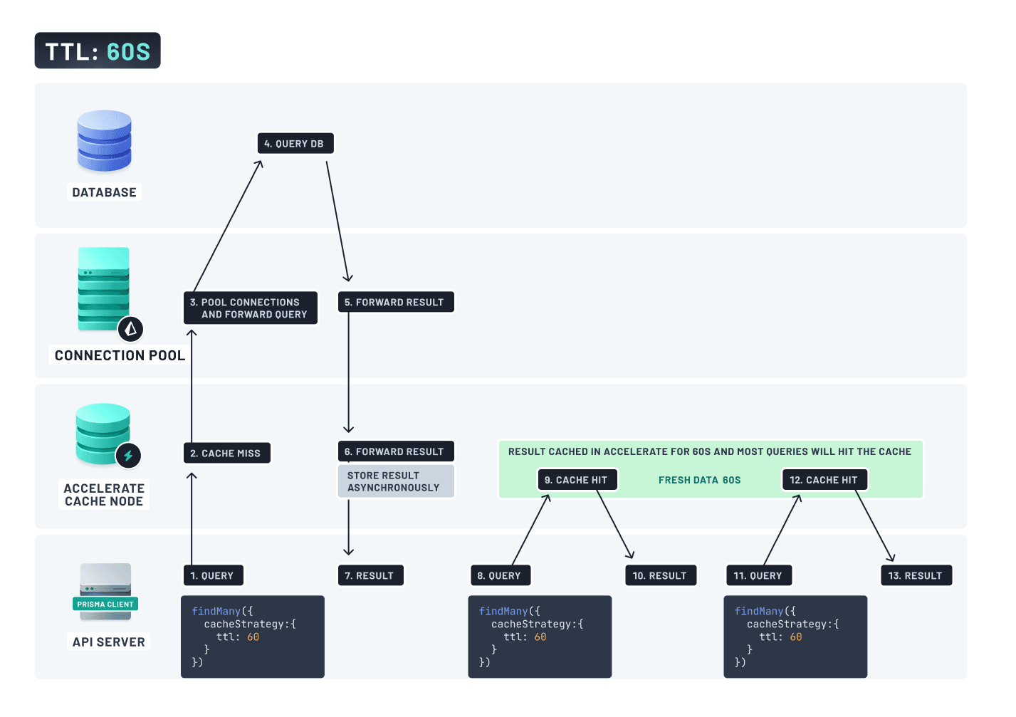 ¥Time-to-Live (TTL) determines how long cached data is considered fresh. By specifying the ttl in seconds, you can control the duration for which data in the cache remains valid. When a read query is executed, if the cached response is within the ttl limit, Prisma Client retrieves the data from the cache without querying the database. If the cached data is not available or has expired, Prisma Client queries the database and stores the results in the cache for future requests.